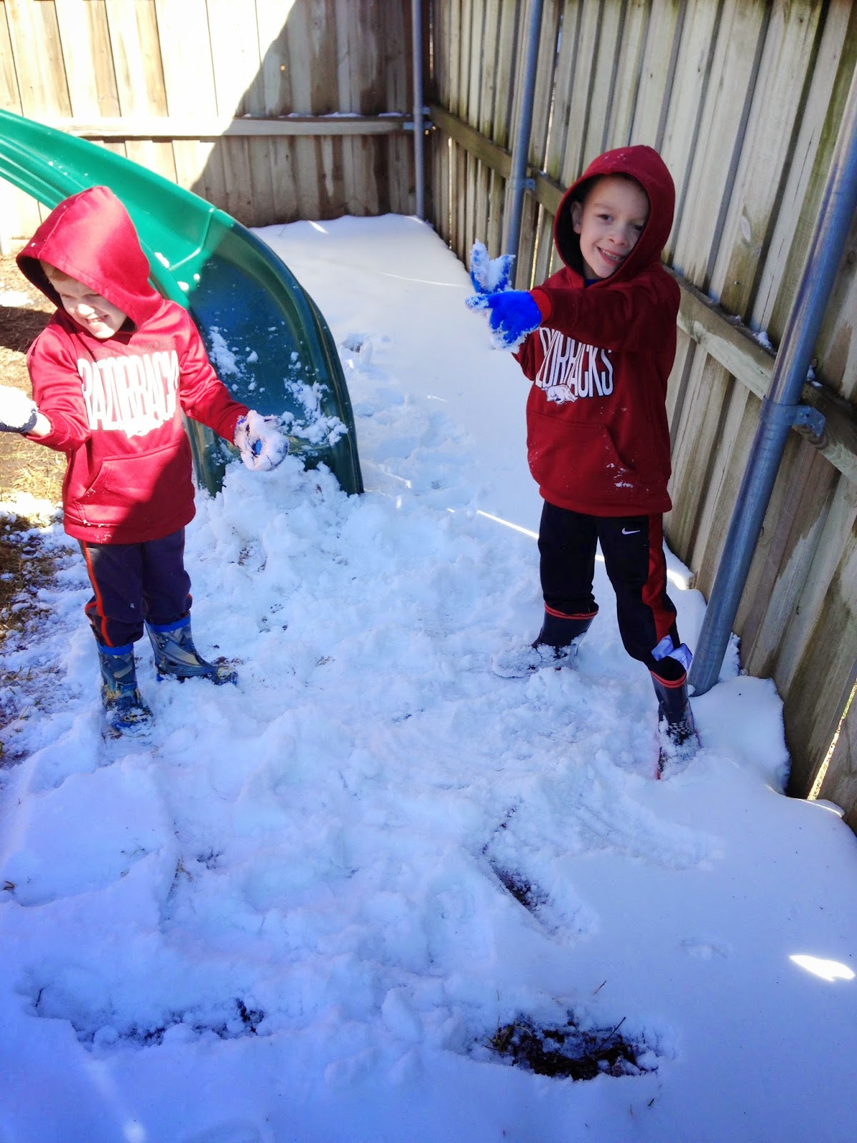 School was cancelled for the boys on Thursday, and they ran outside to get a taste of the snow in the morning. So fun!